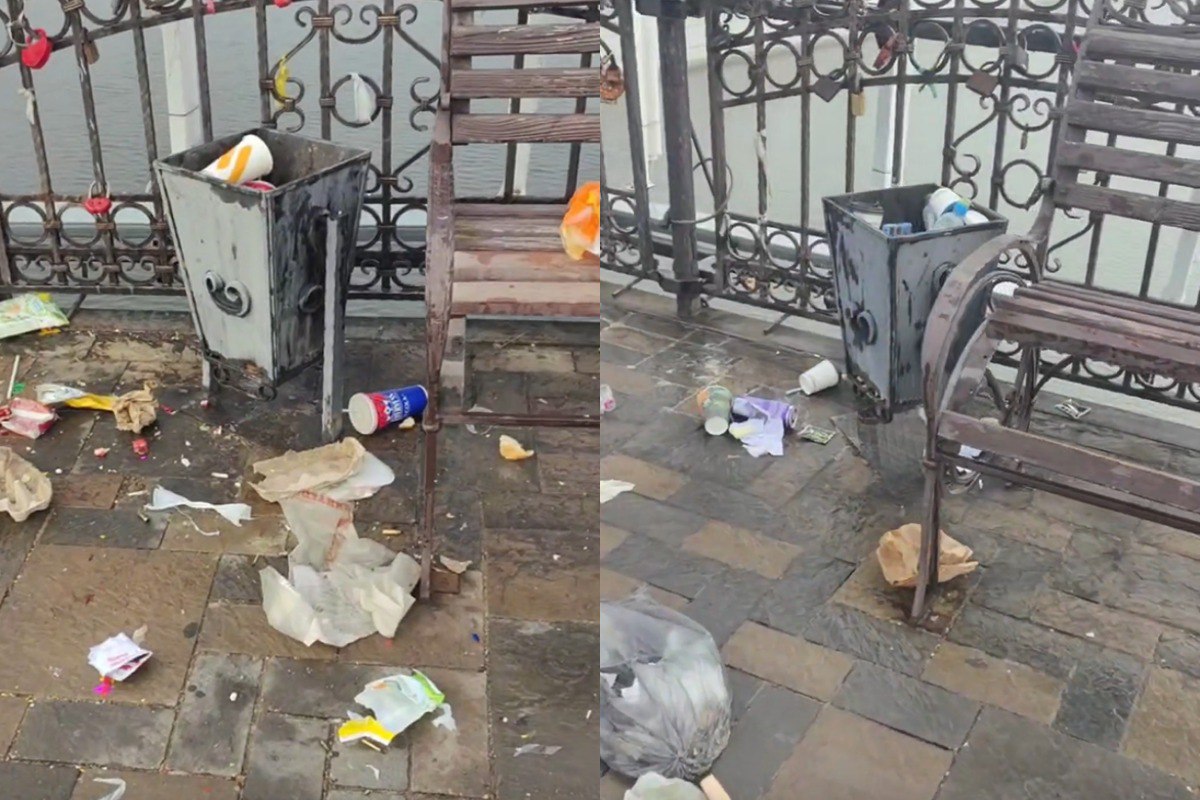 Астраханцы сняли на видео, как выглядит мост Влюбленных ранним утром. Вся пешеходная часть засыпана мусором.