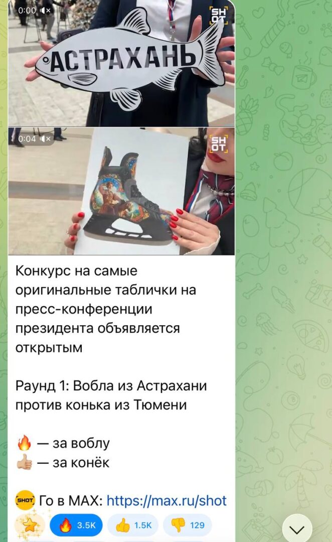 Также популярный телеграм-канал SHOT нашел конкурента нашей рыбке. На прямую линию журналист из Тюмени привез табличку в виде фигурного конька, на которой были изображены главные персонажи сказки «Конек-Горбунок». Эти две таблички сразились в баттле. Тем, кому понравилась наша рыбка, нужно было поставить «огонек», а тем, кому приглянулась идея с коньком, — «класс». Наша рыбка вышла в лидеры, за нее проголосовали около 3 500 пользователей.