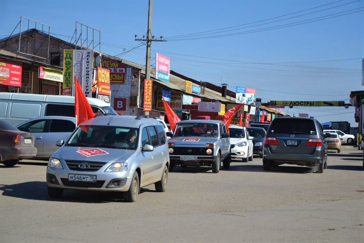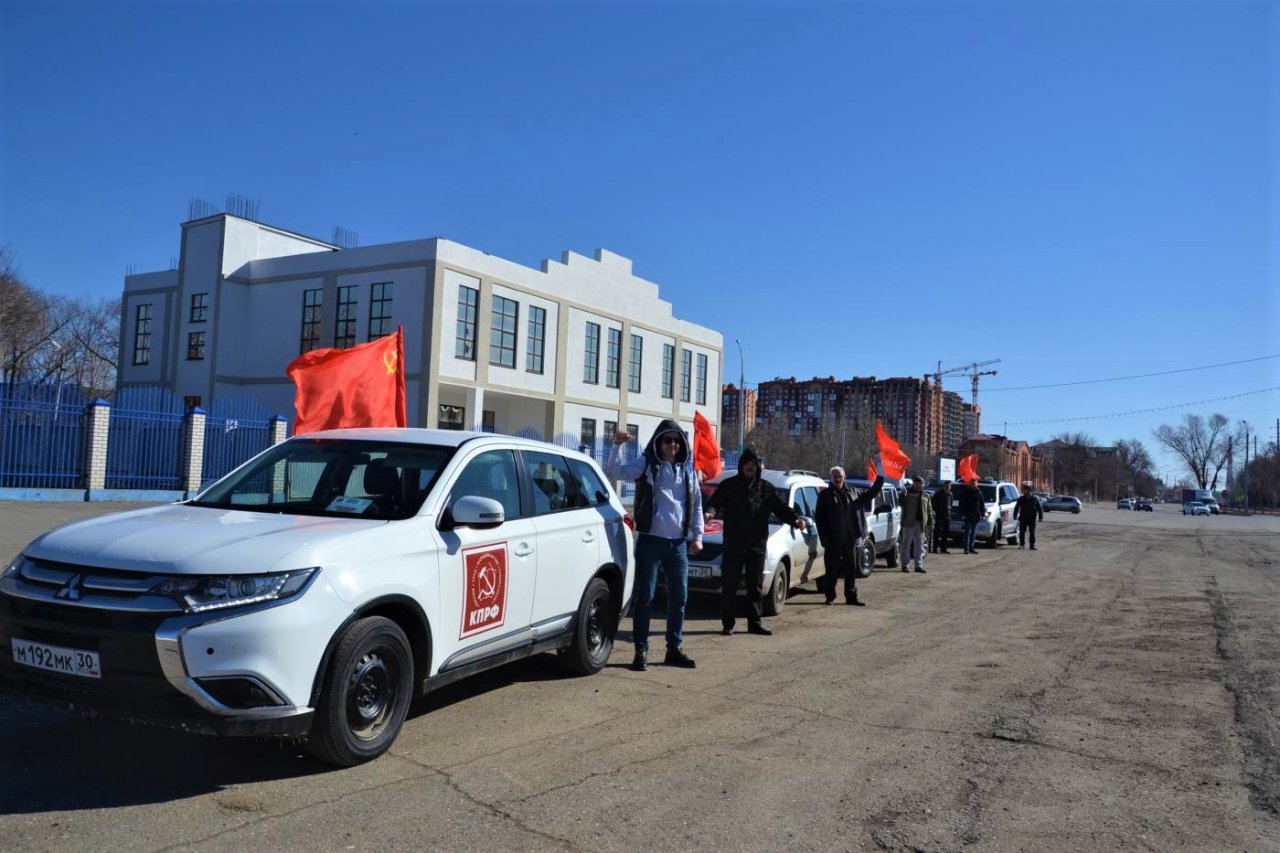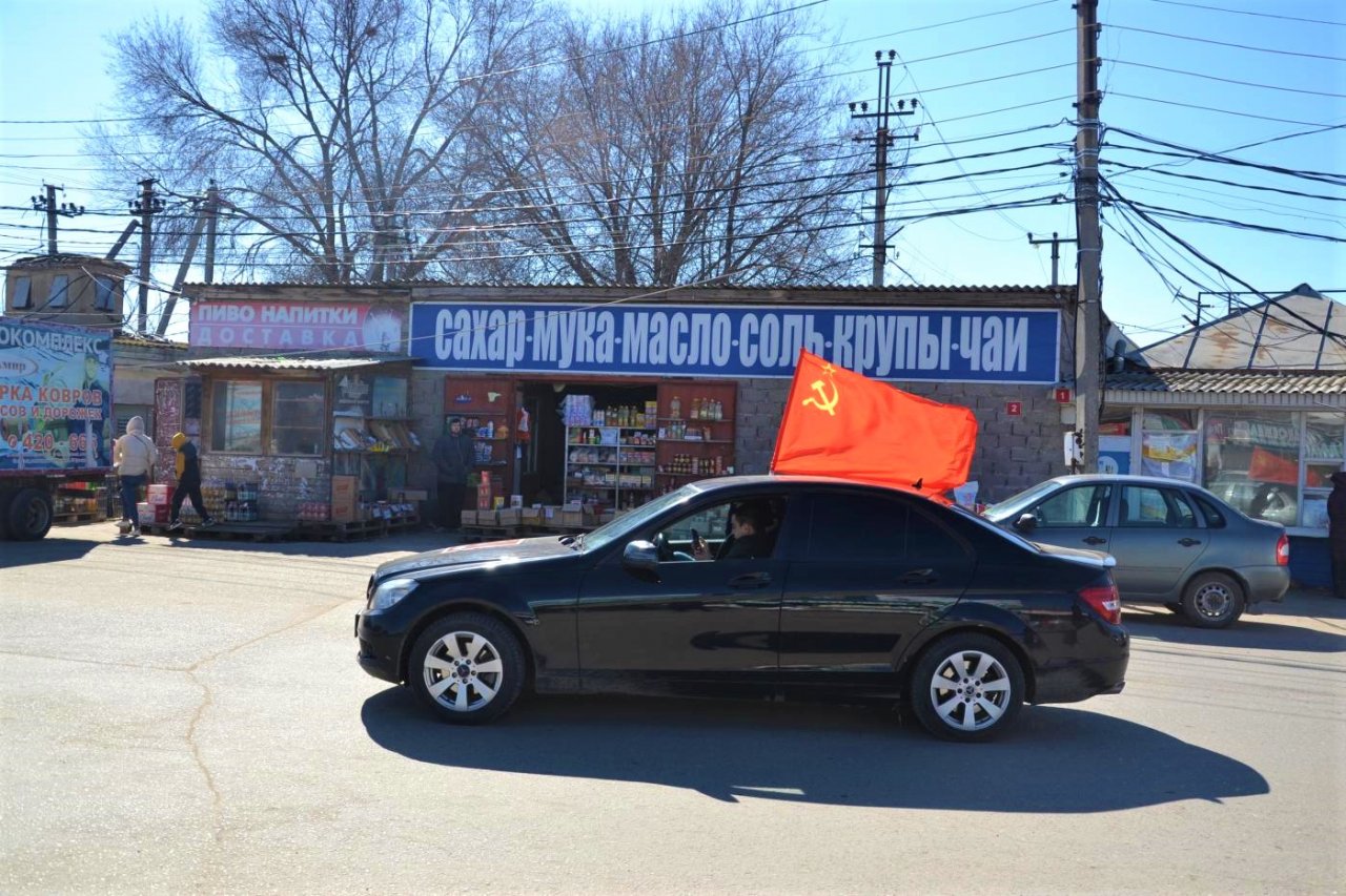 Колонна из пяти машин под флагами СССР, КПРФ и копией Знамени Победы стартовала от областного комитета КПРФ, после чего в течение двух часов ездила по улицам Астрахани. Коммунисты останавливались у мемориалов воинской и трудовой славы, заезжали на многолюдные рынки, привлекая к себе внимание автомобилистов и пешеходов.
