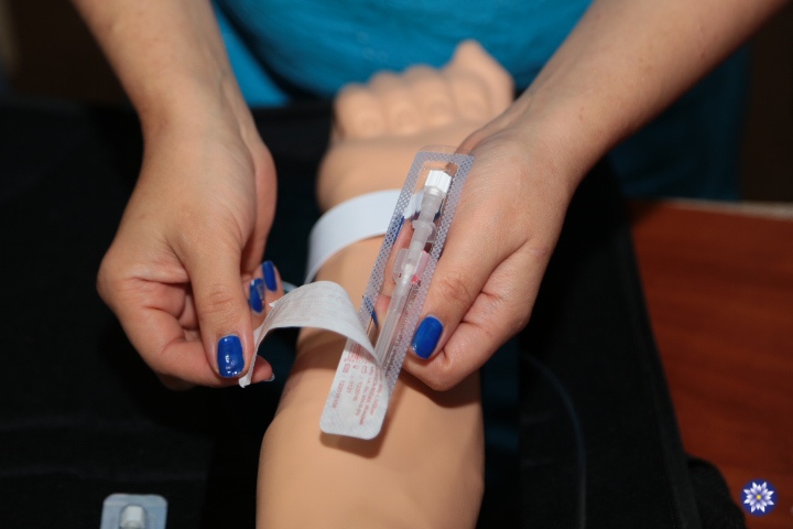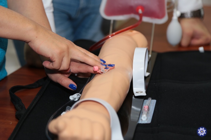 Также, в рамках курса, отрабатывали действия при анафилактическом шоке — аллергической реакции немедленного типа, при которой вена может быть еле видимой. Главный организатор форума Диана Кирильченко показывала стоматологам на пластмассовой руке, как в таких случаях, не теряя драгоценного времени, вкалывать специальную иглу для доступа к венам, куда в дальнейшем по приезду скорая введет препарат.