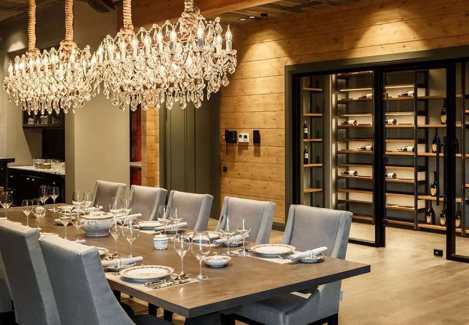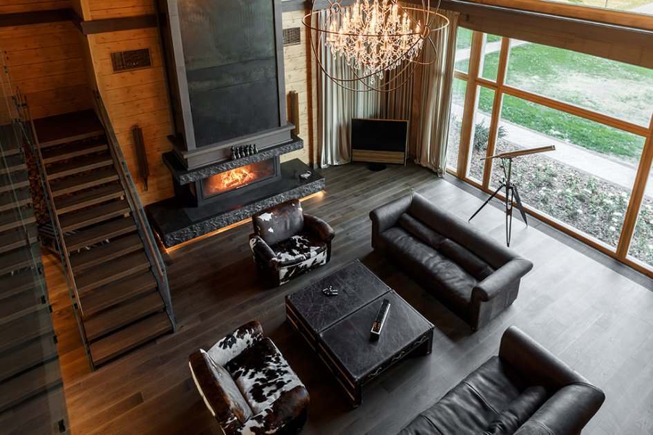 Внутри типичный лакшери набор — мебель ручной работы, винтажные светильники, антиквариат… Но все в нужных пропорциях, провинциальной «богатости» нет и в помине. Классический охотничий домик с интересными деталями в интерьере — например, велосипед под раковиной, не поскучаешь. Бильярдная, гардеробная с рыбацкими принадлежностями, спортзал, спа-зона с сауной, хаммамом и купелью, домашний кинотеатр, в общем есть все, чтобы месяц не выходить с территории дачи и веселиться.