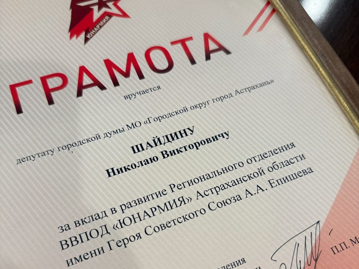 В ходе мероприятия депутат Николай Шайдин был награжден грамотой за вклад в развитие регионального отделения ВВПОД «ЮНАРМИЯ» по Астраханской области имени Героя Советского Союза А.А. Епишева. Грамоту вручил начальник штаба реготделения «ЮНАРМИИ» Павел Мамонтов.