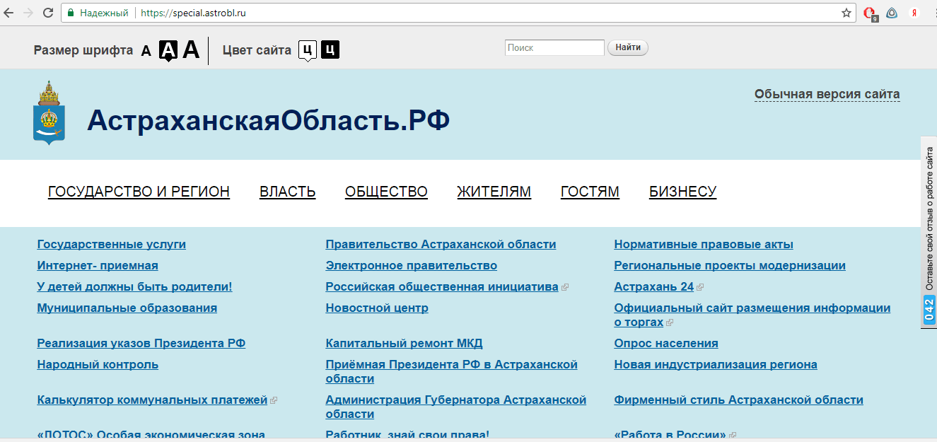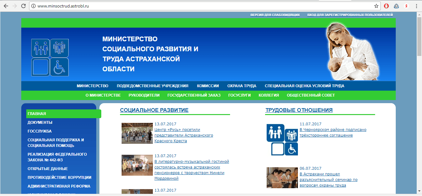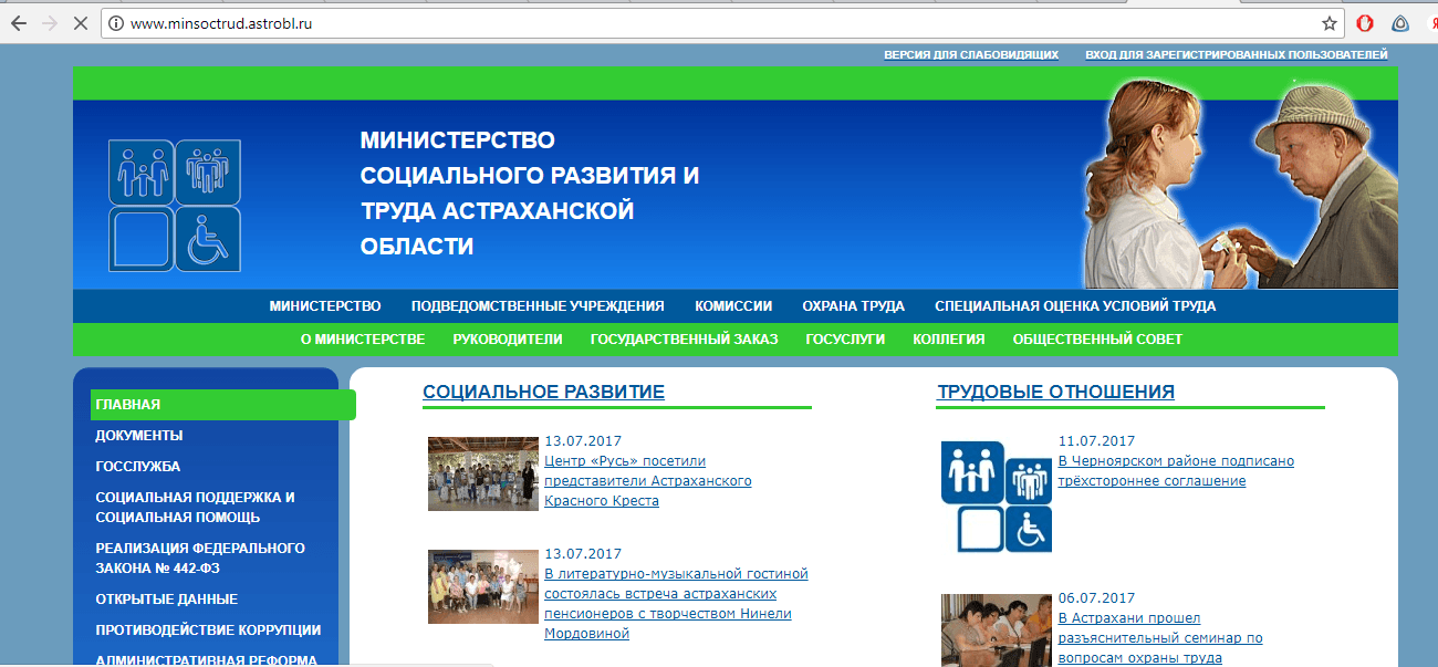 Астраханский сайт министерства, который занимается становлением здорового общества, не доступен для инвалидов по зрению. Хитрая электронная страница министерства социального развития Астраханской области имеет вкладку «версия для слабовидящих», но по ссылке на нее — заглушка (значок «#» при загрузке на адресной строке). Проще говоря, нажав на нее, ничего не меняется, вы переходите на обычный сайт министерства.