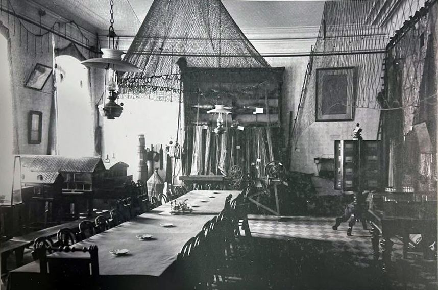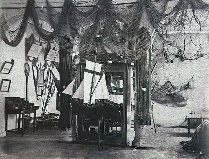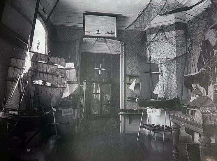 «Среди экспонатов были ценные коллекции рыб, птиц, принадлежности для рыболовства, модели судов, картины, рисунки и фотографии, связанные с рыболовством».