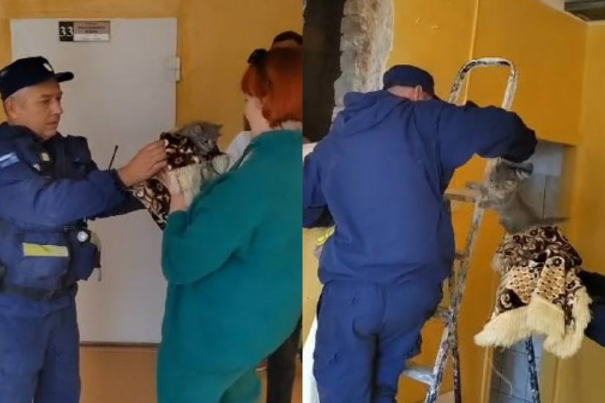 Изначально звонок спасателям поступил тревожный: из стены доносятся жуткие звуки. Прибыв на место и вскрыв вентиляционный короб, они обнаружили такую картину: внутри сидел серый комочек и жалобно мяукал.