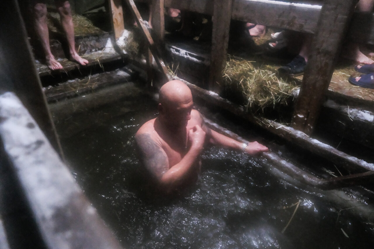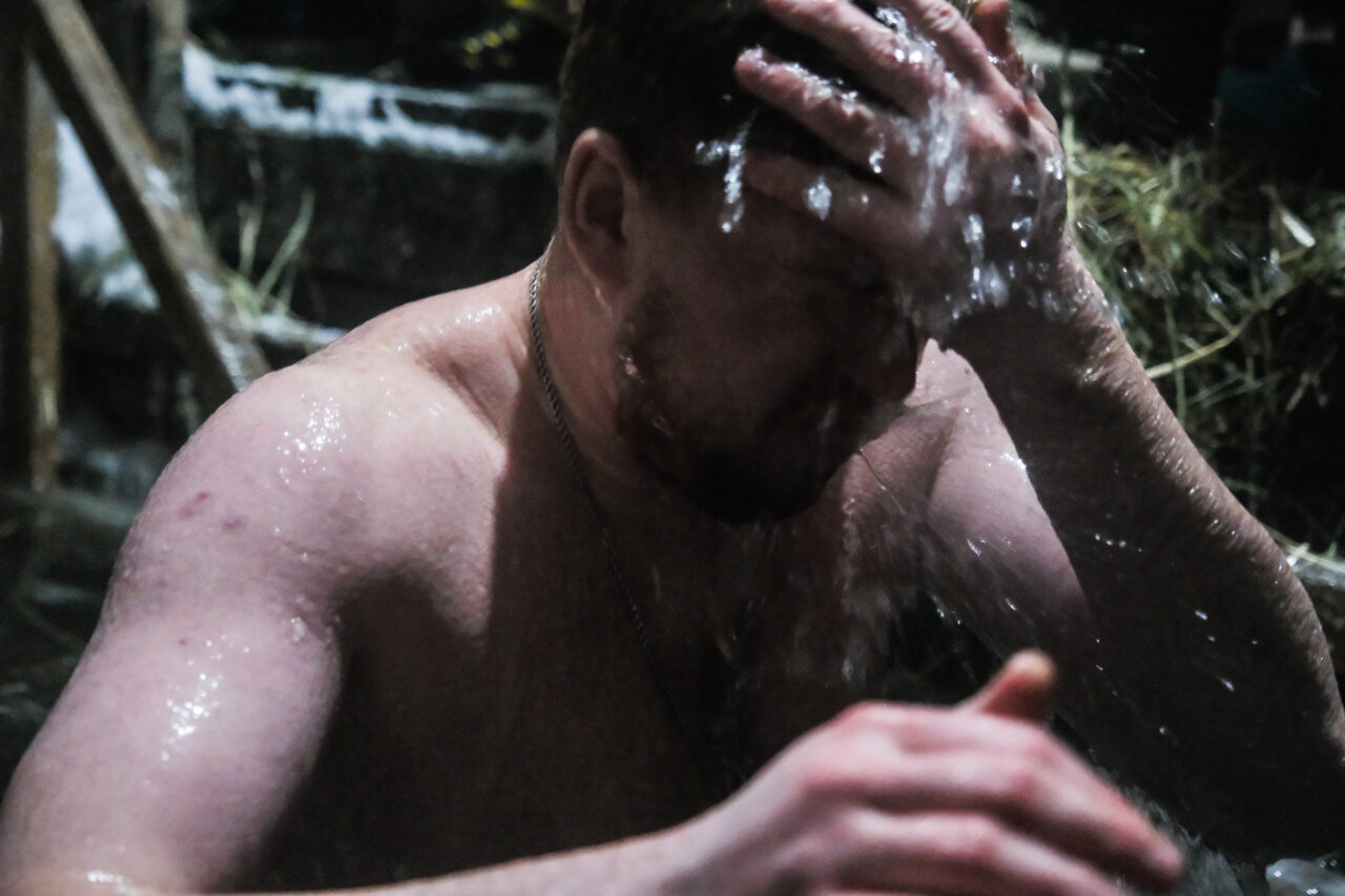 Желающие совершить обряд вели себя спокойно и сосредоточенно. Окунались в ледяную купель и тут же, не задерживаясь, одевались. На момент съемки не было замечено маленьких детей, которые тоже приходят окунуться с мамами. Ночью мы видели только одного мальчика лет тринадцати.