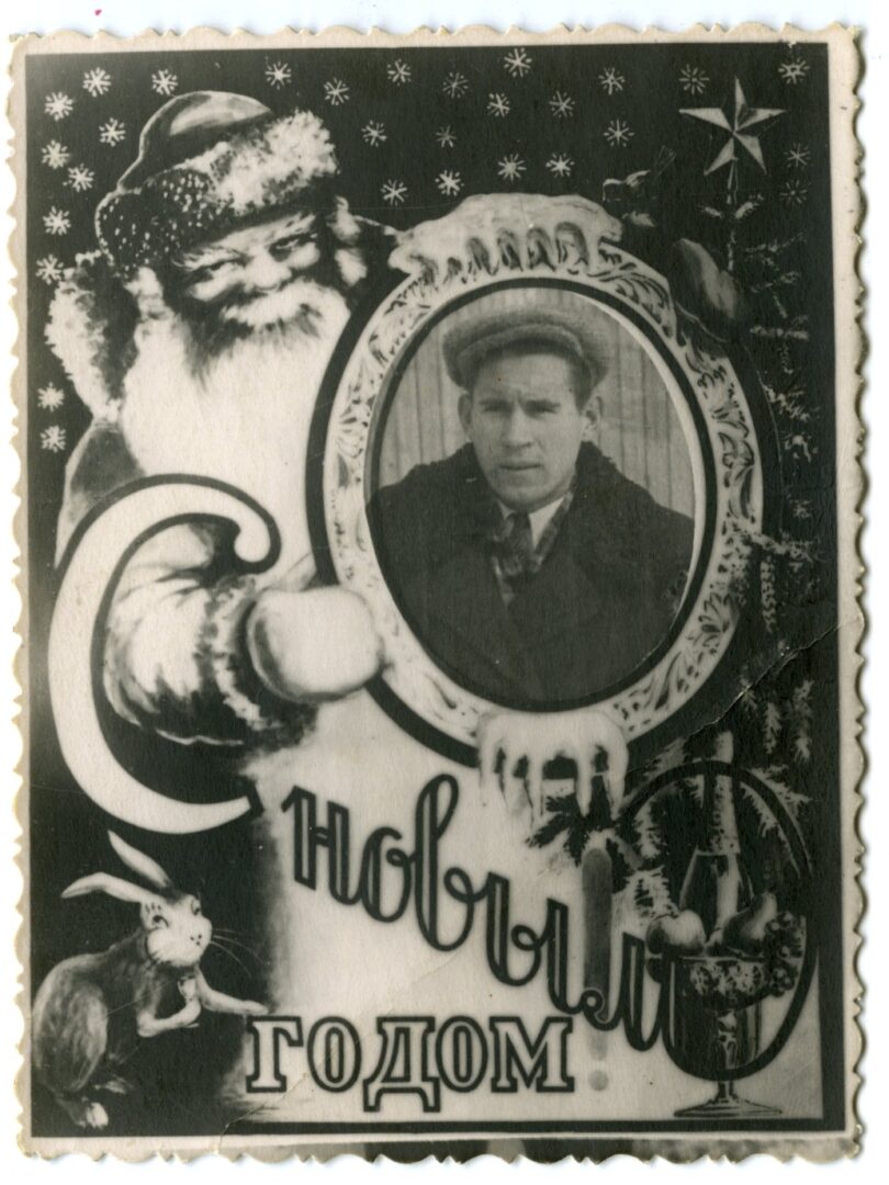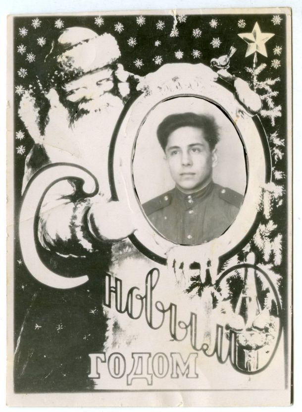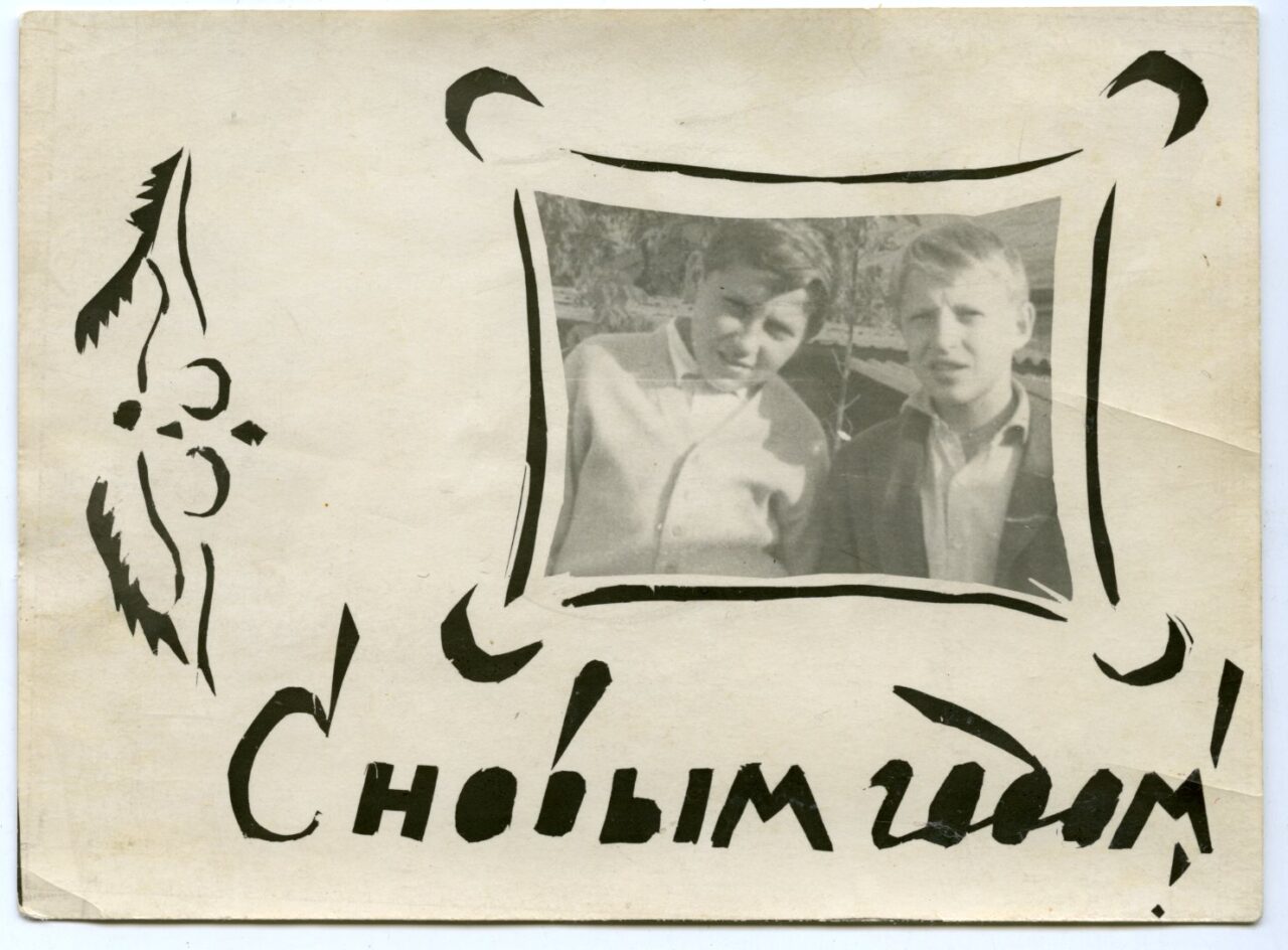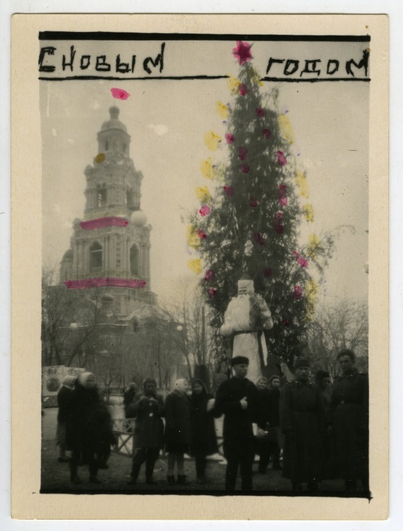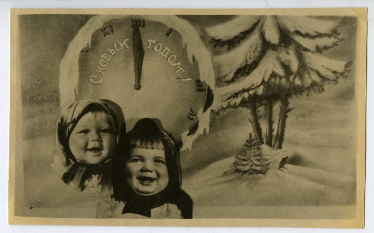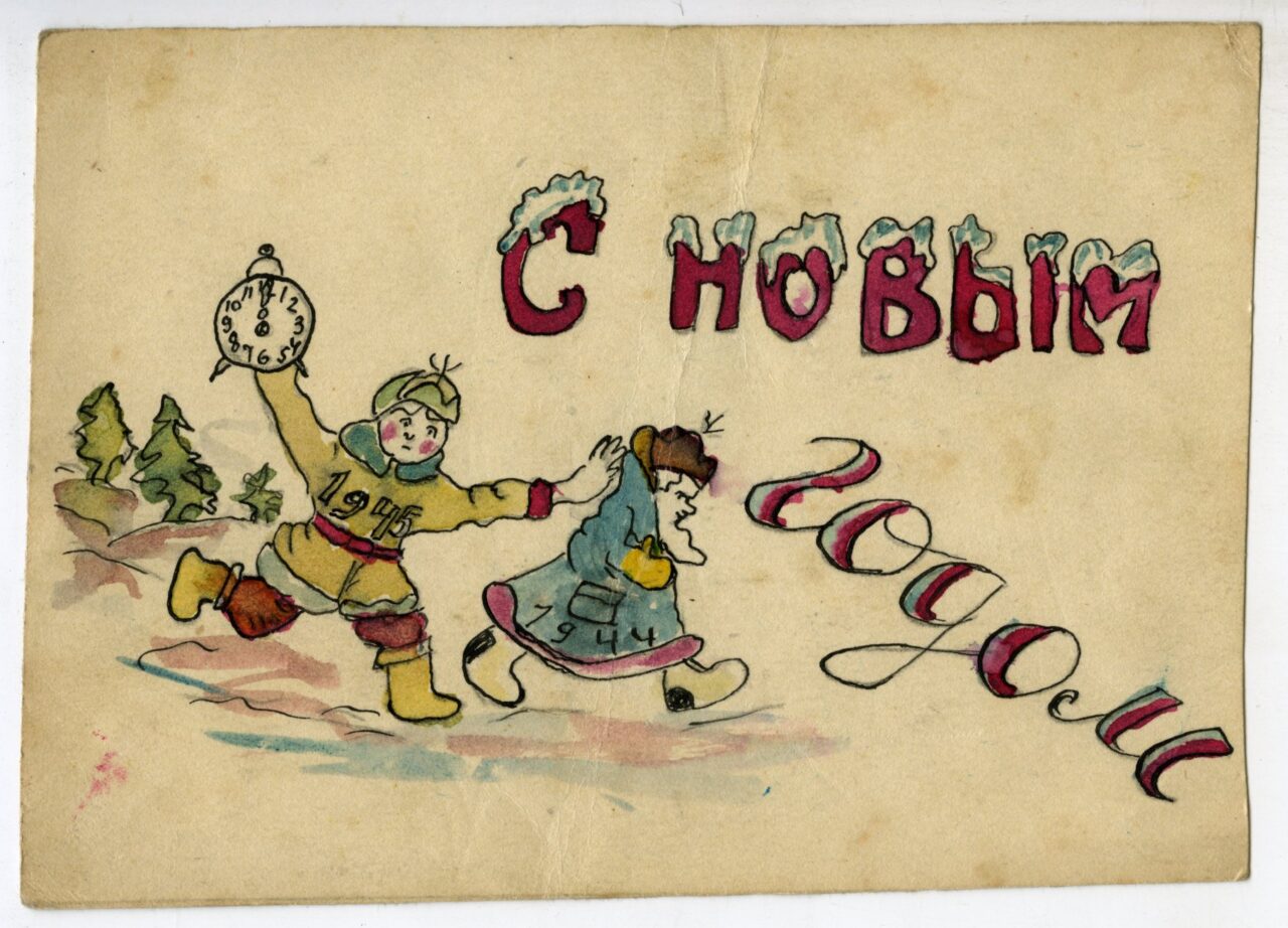 Вот самодельная открытка, очень красноречиво демонстрирующая настроение наступающего 1945 года. В воздухе уже пахло победной весной, соответственно менялось настроение людей. Но в этом жесте наступающего года, присутствует самое главное: прощались с еще одним тяжелым военным годом.