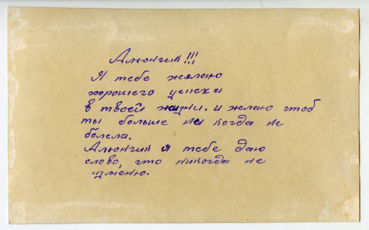 Фото вроде обычное, а вот поздравление на обороте заставляет по-другому взглянуть на этого человека. Сколько страсти и, вероятно, любви было в его жизни! Непонятно, завидовать или сочувствовать неизвестному Алюнчику…