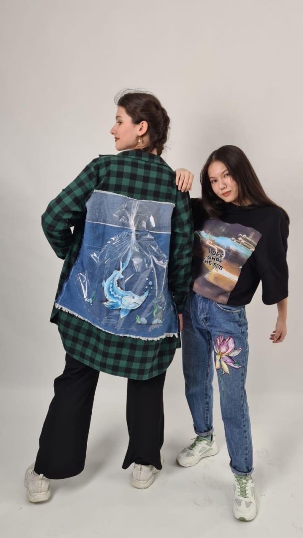 В номинации «Апсайкл» победителем стала Фаризат Досова. Она сшила жилетку из старых лоскутков ткани, применив технику украшения tie-dye. Второе место заняла Мария Григорьева, обновившая старую куртку японским орнаментом. А третье место присудили Ренате Халиевой. Она изготовила из старых джинсов рубашку с рисунком, который олицетворяет экологические проблемы Каспия.