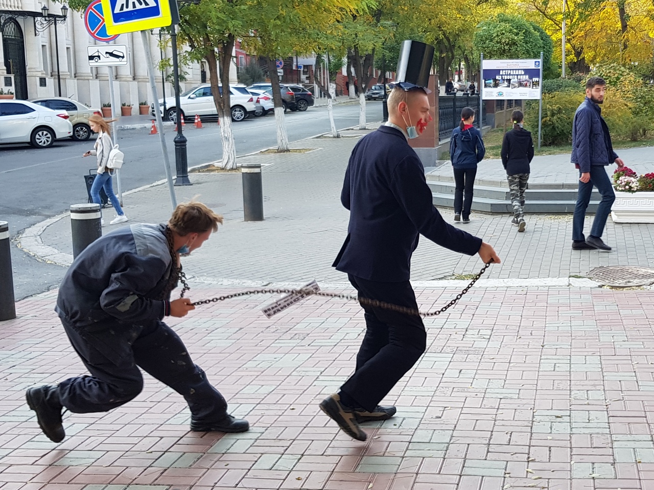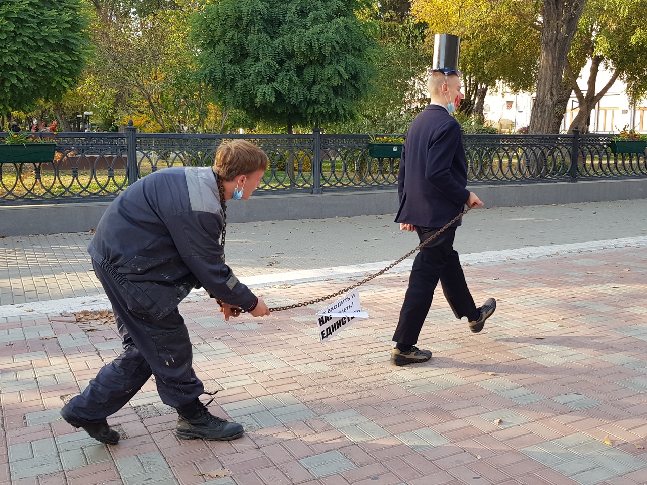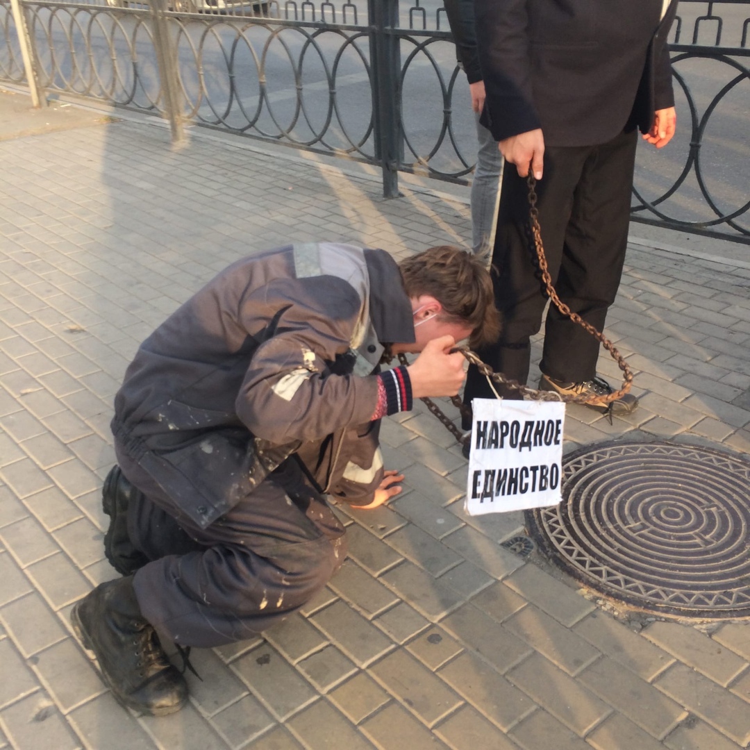 Юные Ленинцы изобразили буржуя ведущего пролетария на цепи, которая символизировала «народное единство», о чем свидетельствовала соответствующая табличка. Данные персонажи прошли все основные улицы центральной части города попутно распространяя листовки, которые объясняли суть происходящего.