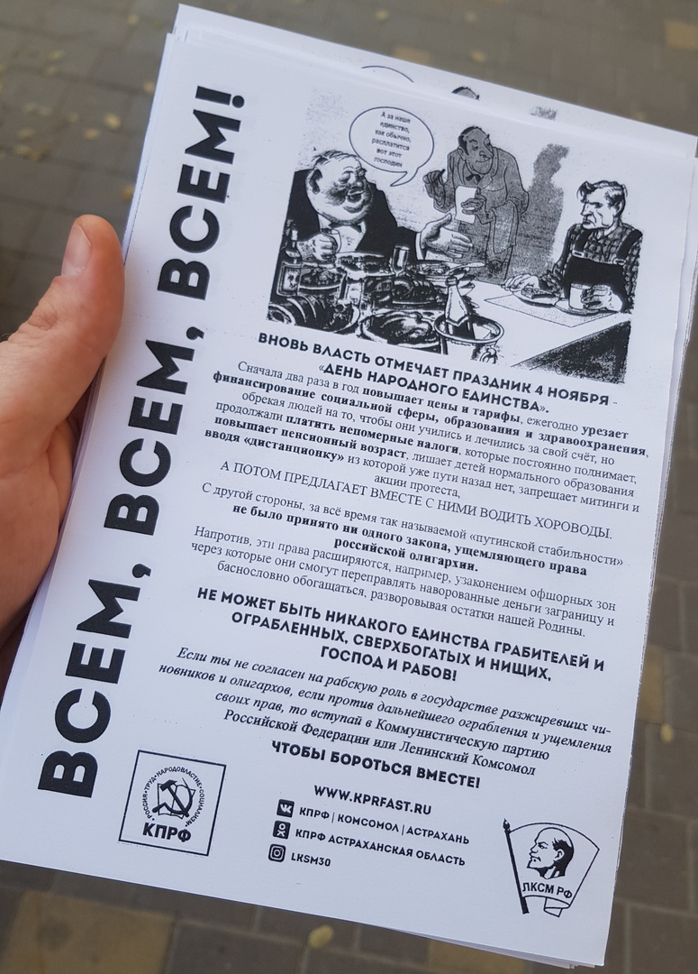 4 ноября астраханская коммунистическая молодежь провела костюмированную акцию, в которой показала, как власть пытается насадить искусственно установленный праздник «День народного единства», который был специально введен, чтобы сместить центр внимания с гораздо более важного дня — годовщины Великой Октябрьской социалистической революции.