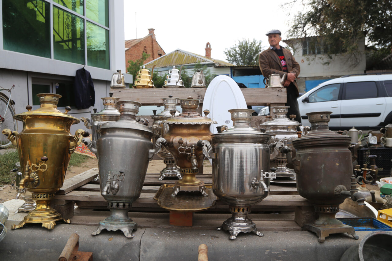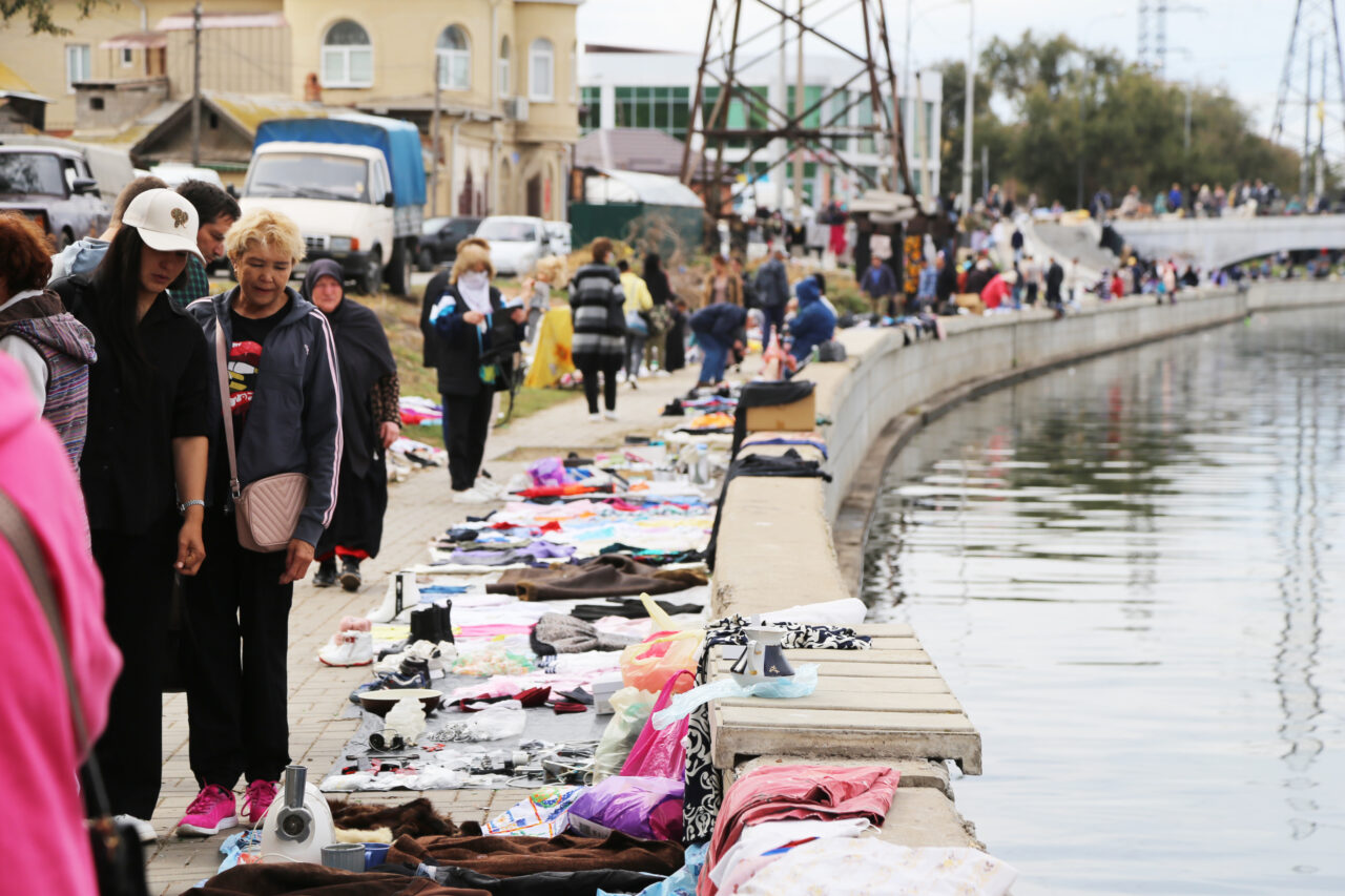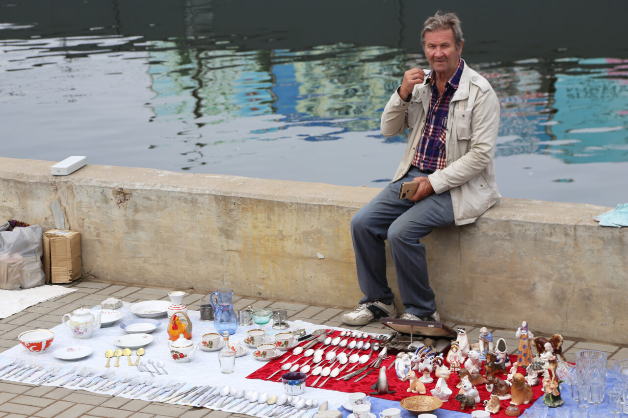 А по обе стороны моста прямо на земле, на ковриках, простынях или картонках, а также на парапете набережной Кутума лежит великое множество различных вещей: одежда, обувь, инструменты, посуда разного вида и назначения. Рядом с весьма изысканным фарфоровым кофейником основательные фаянсовые тарелки с клеймом «общепит». Как говорится, на все вкусы. Осколки прежней жизни.