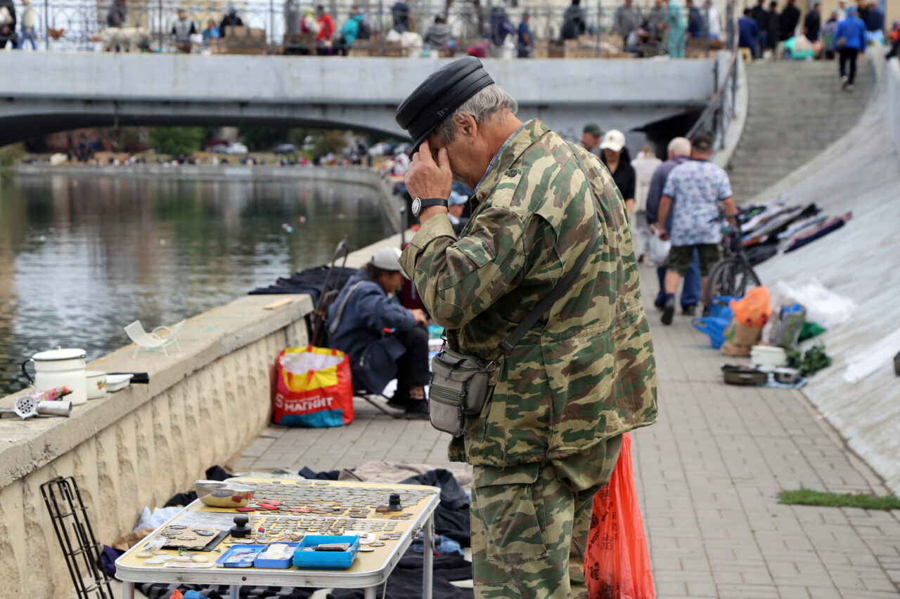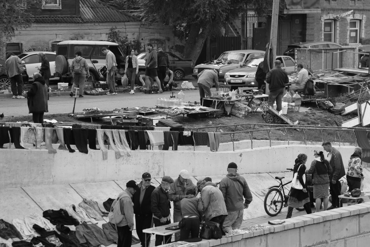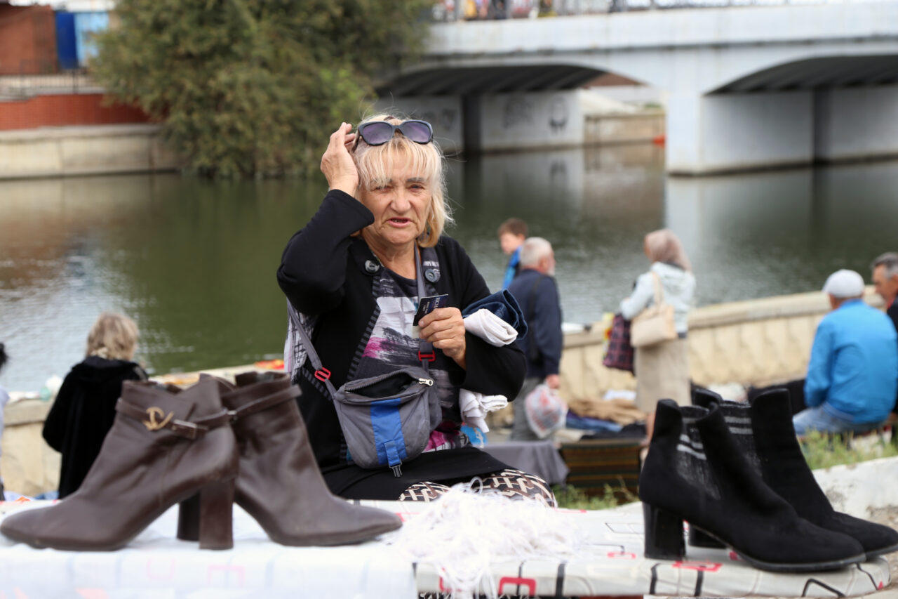 А по обе стороны моста прямо на земле, на ковриках, простынях или картонках, а также на парапете набережной Кутума лежит великое множество различных вещей: одежда, обувь, инструменты, посуда разного вида и назначения. Рядом с весьма изысканным фарфоровым кофейником основательные фаянсовые тарелки с клеймом «общепит». Как говорится, на все вкусы. Осколки прежней жизни.