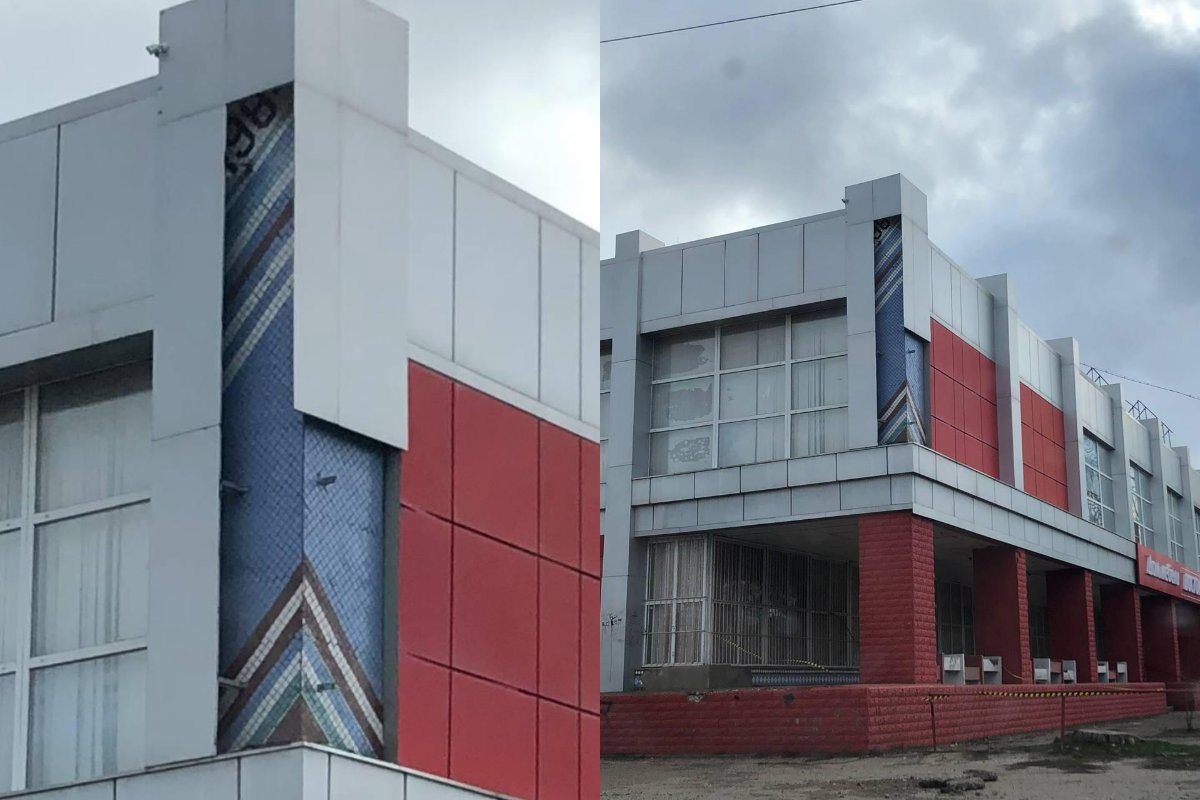 «Очередной раз ветер открыл нам мозаику. В 2023 году он сорвал баннер на детской поликлинике на Спутнике и открыл прекрасное панно. В этот раз в районе поселка Свободный отлетел вентфасад на бывшем универмаге «Восток». Можно разглядеть год — 198х какой-то», — написали в телеграм-канале.