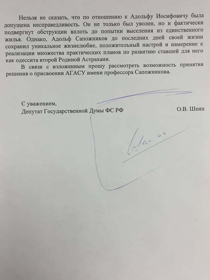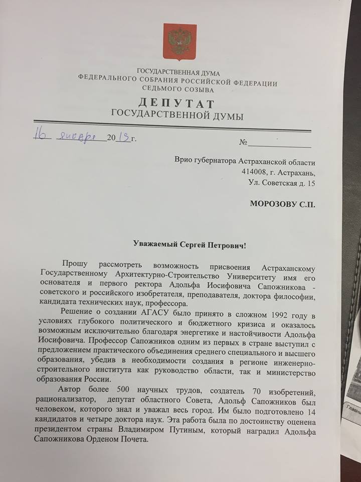 Олег Шеин добавил, что обратился к врио губернатора Сергею Морозову с предложением присвоить АГАСУ имя его основателя и первого ректора профессора Адольфа Сапожникова.