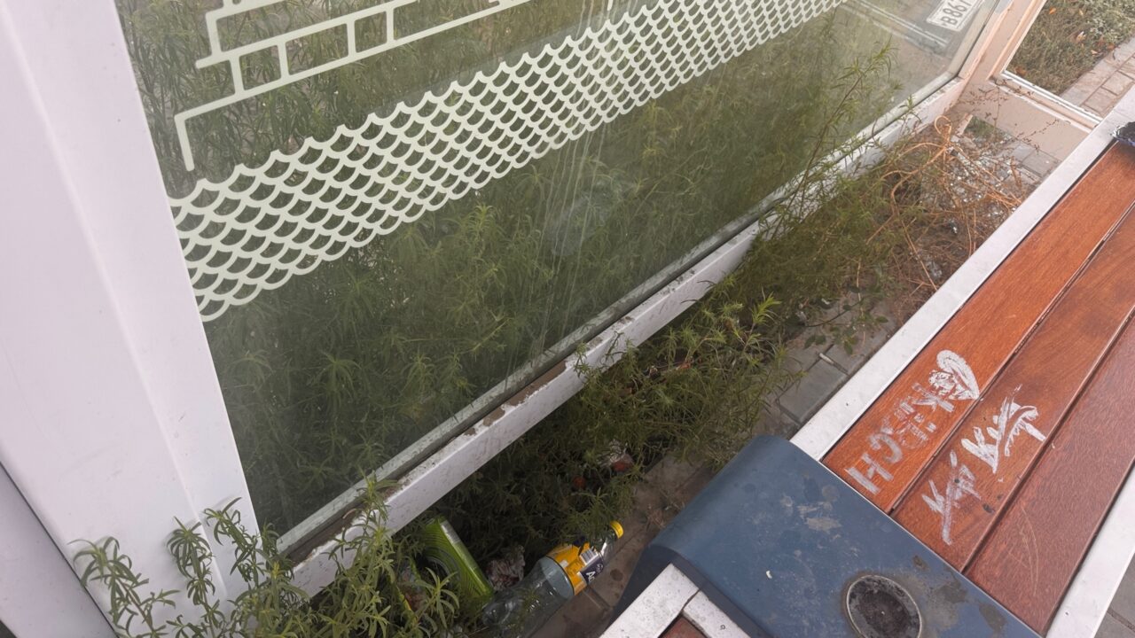 Боковая часть павильона разбита — осколки стекла лежат на земле. Задняя сторона заросла травой и бурьяном, а вокруг валяются бутылки, упаковки и прочий мусор.