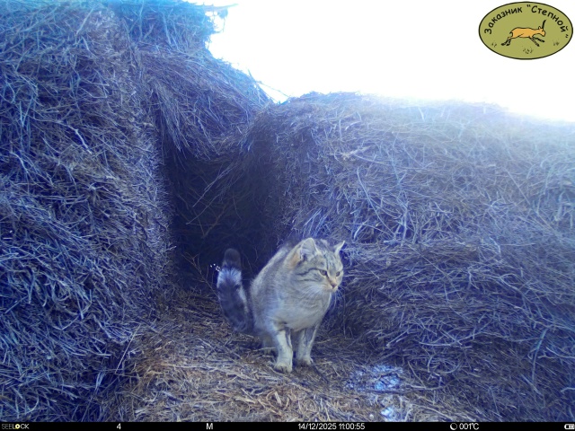 Упитанного кота камышовой расцветки сняла фотоловушка, установленная у стога сена в заказнике «Степной» Астраханской области. Животное нашло убежище в копне сухой травы. Хотя внешне оно и похоже на домашнего барсика, на кадре очень редкий степной кот.