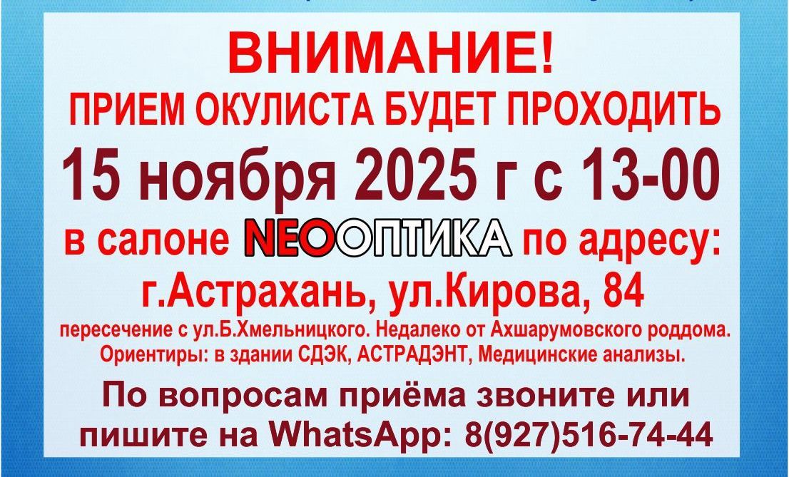 Приём специалистов будет проходить 15 ноября с 13:00 по адресу: г.Астрахань, улица Кирова, 84, салон NEO ОПТИКА (пересечение с Б.Хмельницкого).