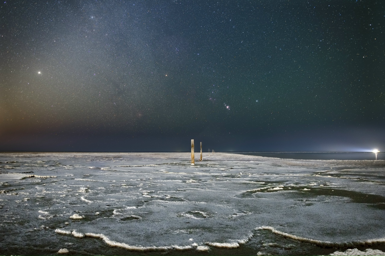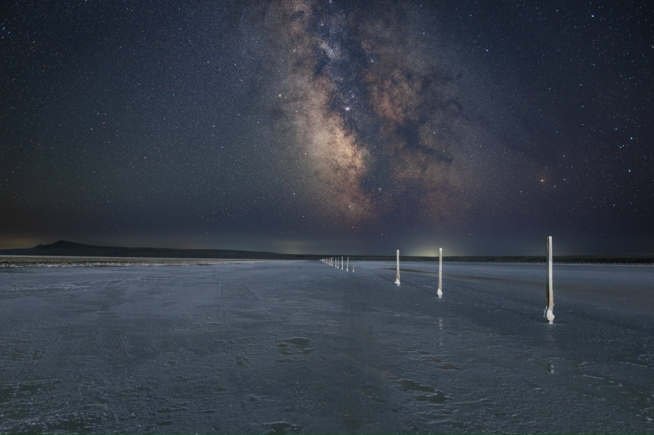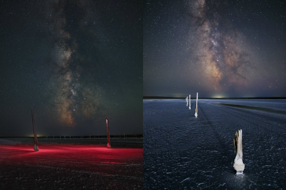 «Белоснежные соляные просторы под звездным небом выглядят фантастически: поверхность озера мерцает в темноте, а вокруг — абсолютная тишина бескрайней степи», — написал фотограф.