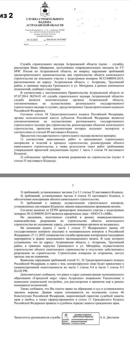 По итогам внеплановой проверки, проведенной специалистами службы строительного надзора Астраханской области, выяснилось, что разрешение на строительство этого объекта не было выдано. В ходе инспекции было установлено, что на стройплощадке действительно ведется строительство в отсутствие действующего разрешения на строительство. Также было зафиксировано, что территория не была огорожена, а доступ на стройку не ограничен, что нарушает требования безопасности.