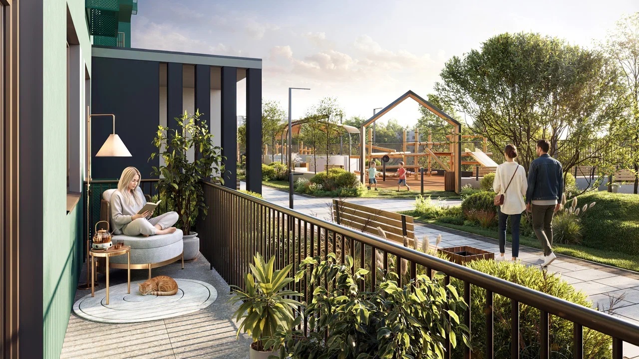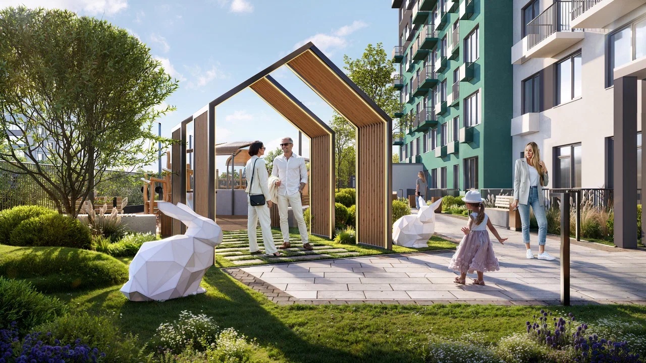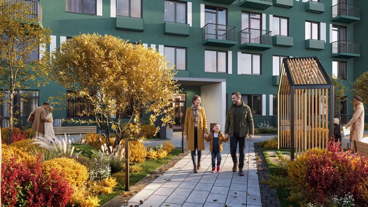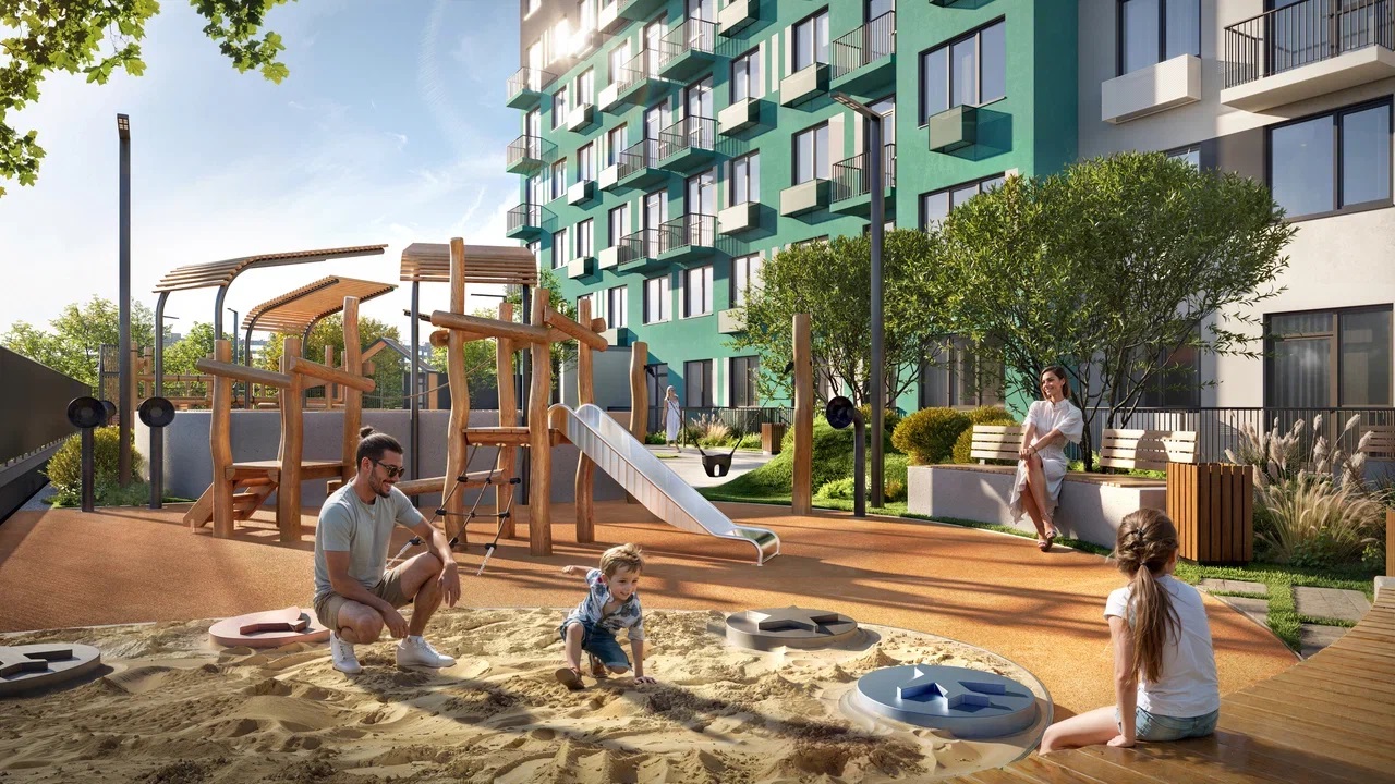 Две игровые площадки для деток от 0 до 4 лет и старше, амфитеатр с водопадом для соседских мероприятий, workout, зона тихого отдыха с лежаками и квартиры с зелеными террасами. Здесь есть всё для жизни без лишней спешки.
