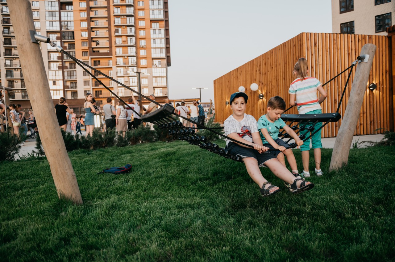Гулять с детьми во дворе одно удовольствие. Для каждого возраста есть отдельные игровые зоны, где любой ребенок найдёт занятие по душе. Малышей заинтересуют бизиборды и качели, а школьники покорят вершину веревочной Эйфелевой башни, станут начинающими альпинистами на 3-D кубах BLOQX или устроят состязания на батуте.