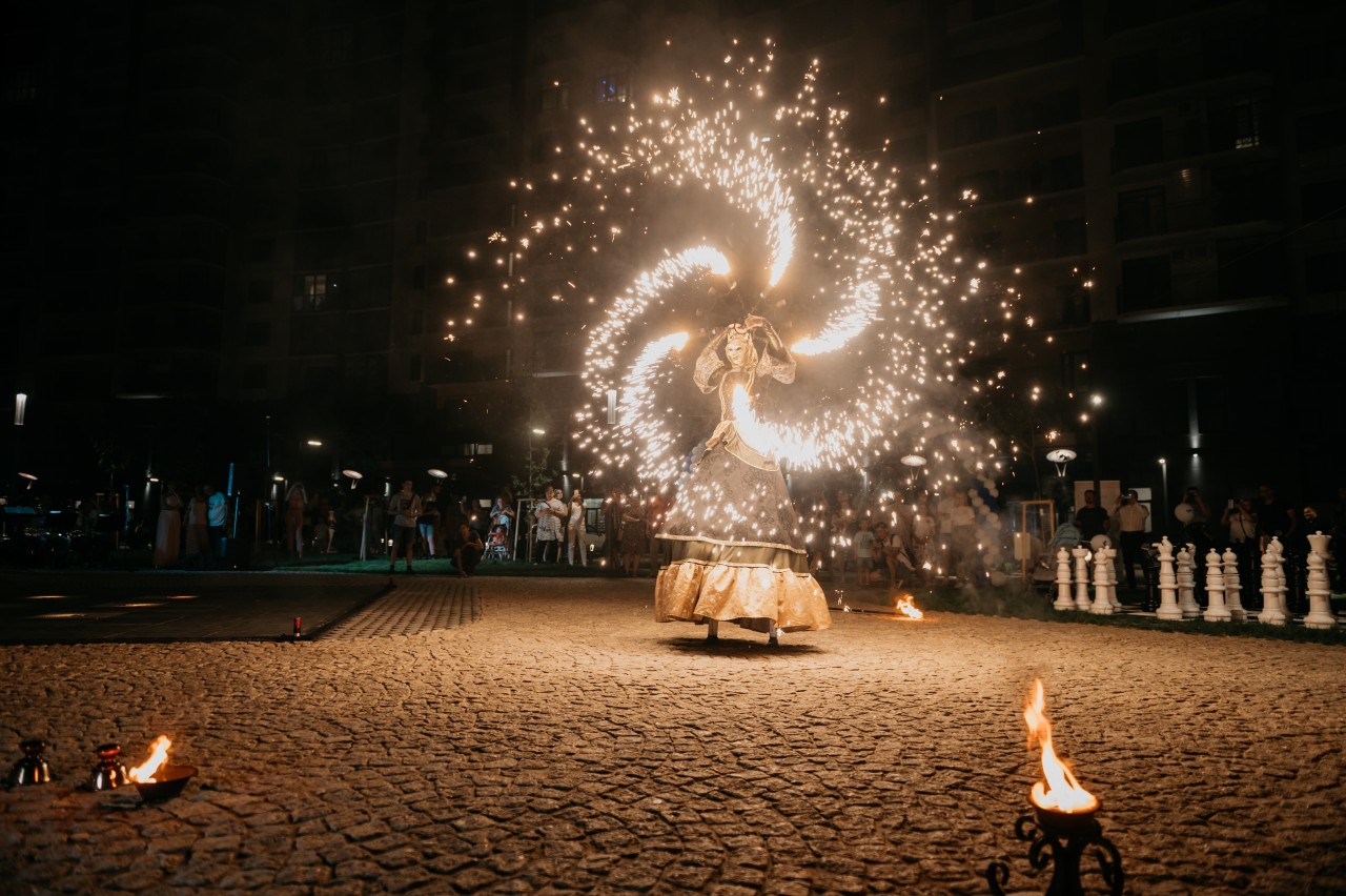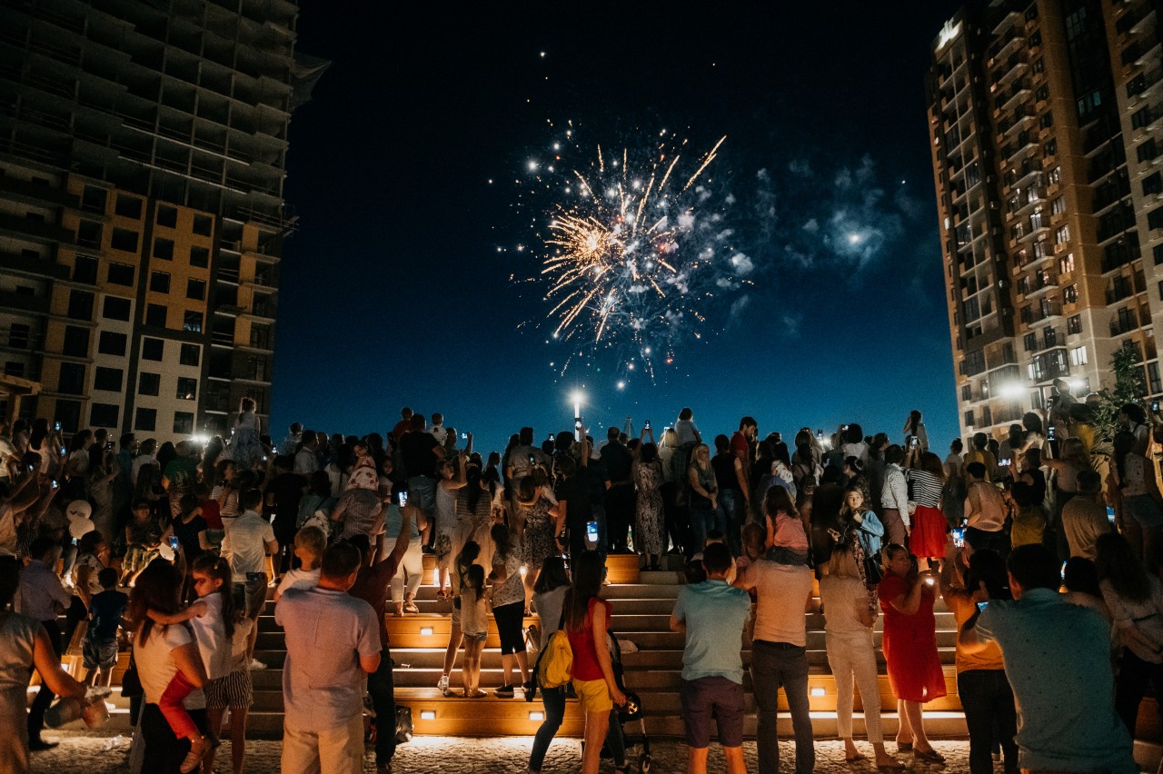 Однако это была только разминка. Самое интересное организаторы оставили «на сладкое». После заката солнца началась наиболее зрелищная часть праздника. Под мелодии оркестра астраханской государственной филармонии и пиротехническое шоу «Огней Каспия» был запущен контактный фонтан с подсветкой. Не успели гости отойти от восхищения, как небо над жилым комплексом расцвело и загорелось яркими вспышками фейерверка.
