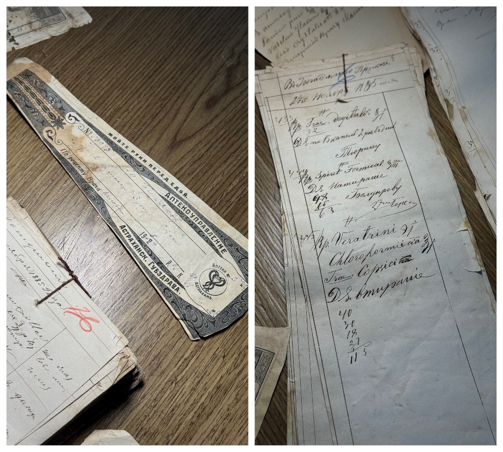 Недавно рабочие, которые ведут ремонт в усадьбе Федорова, рядом с аптекой по улице Кирова (бывшая Полицейская), принесли в аптеку сверток с бумагами, среди которых есть и сигнатура (аналог современной аннотации к лекарству), причем советского периода, когда аптека была уже национализирована; деловые бумаги и с десяток рецептов (в то время они назывались представлениями), датированные 1846-1887 годами.