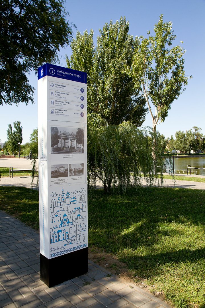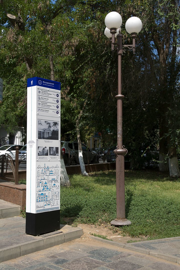 Работы по внедрению туристической навигации ведутся «Центром стратегического анализа и управления проектами» совместно с администрацией города в рамках проекта «Обновленная Астрахань». В оформлении современных объектов городской среды используется фирменный стиль региона и его элементы, гармонично дополняющие внешний вид.