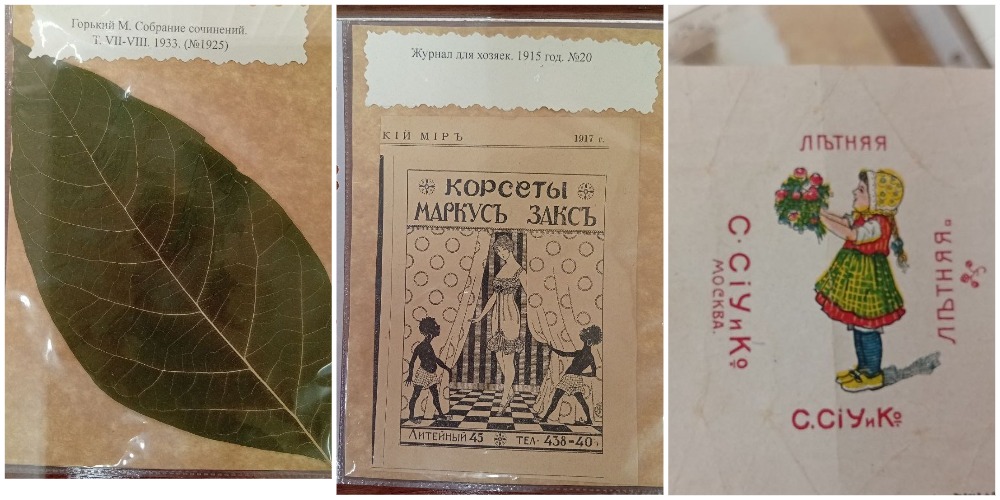 Засушенные в книгах цветы – самый заурядный артефакт. Но огромный лист фикуса, найденный в книге Максима Горького, уже интереснее. А еще листок календаря из 1925 года; реклама дамского белья за 1917 год, оставленная в журнале, изданном в 1915 году (значит, и дальше этот журнал читали); фантик от конфеты фабрики «С.Сиу и К», которая в 1920 году стала называться фабрикой «Большевик»: забытое фото учащегося реального училища, записка 1876 года, обнаруженная в старинной книге 1788 года и совершенно обычный детский рисунок …