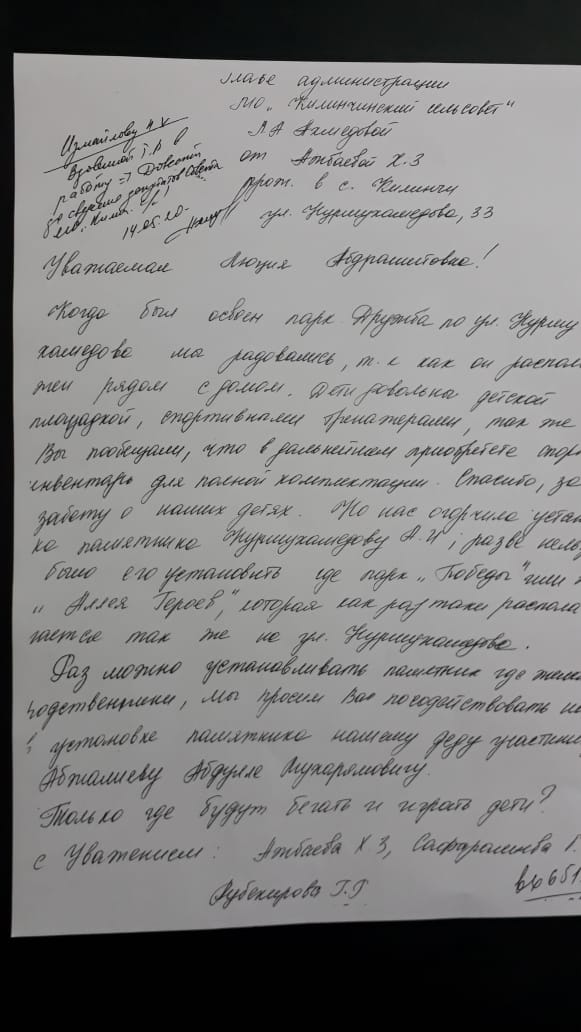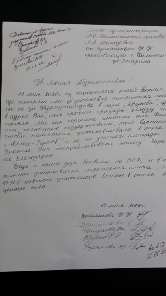 В ходе беседы выяснилось, что руководство МО «Килинчинский сельсовет» предлагали установить памятную доску в другом месте – в парке «Победа». По мнению Люции Ахмедовой, чтить память нужно все-таки в зоне, который соответствует тематике, а не в детском спортивном парке, где в плиту может полететь футбольный мяч. В качестве примера она напомнила историю, которая недавно всколыхнула всю Астрахань — когда школьник разбежался и ударил ногой памятник, погибшим астраханцам и разбил его.