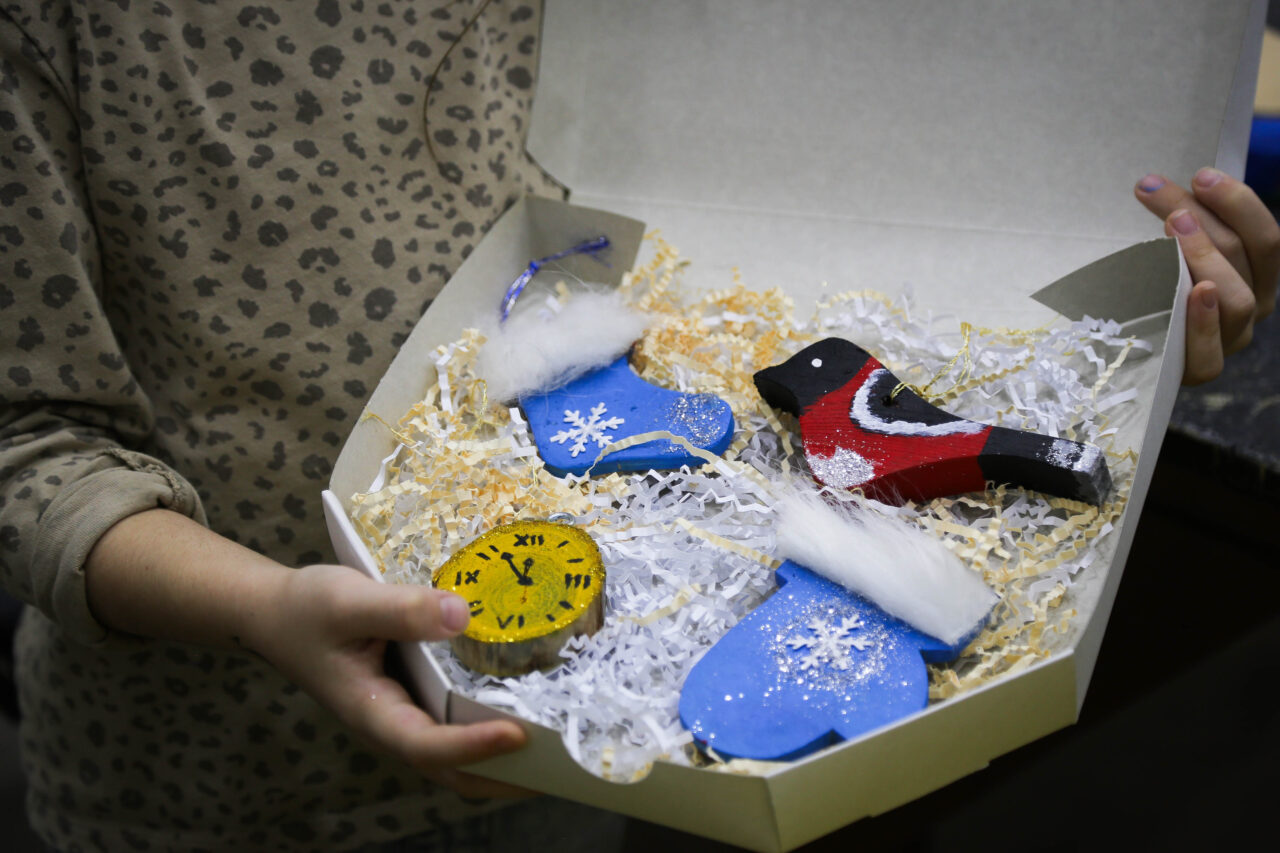 Дети, начиная с 5 лет и старше, с энтузиазмом использовали краски, бусинки, ленты, блестки и другие материалы, чтобы создать свои авторские игрушки. Когда работы были завершены и высохли, каждому участнику вручили коробочки с бумажным наполнителем, чтобы игрушки хранились как набор и приносили радость в будущем.