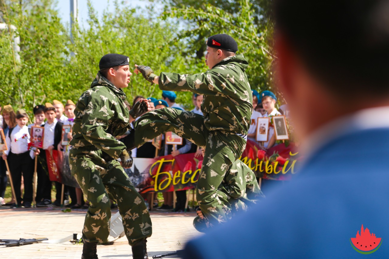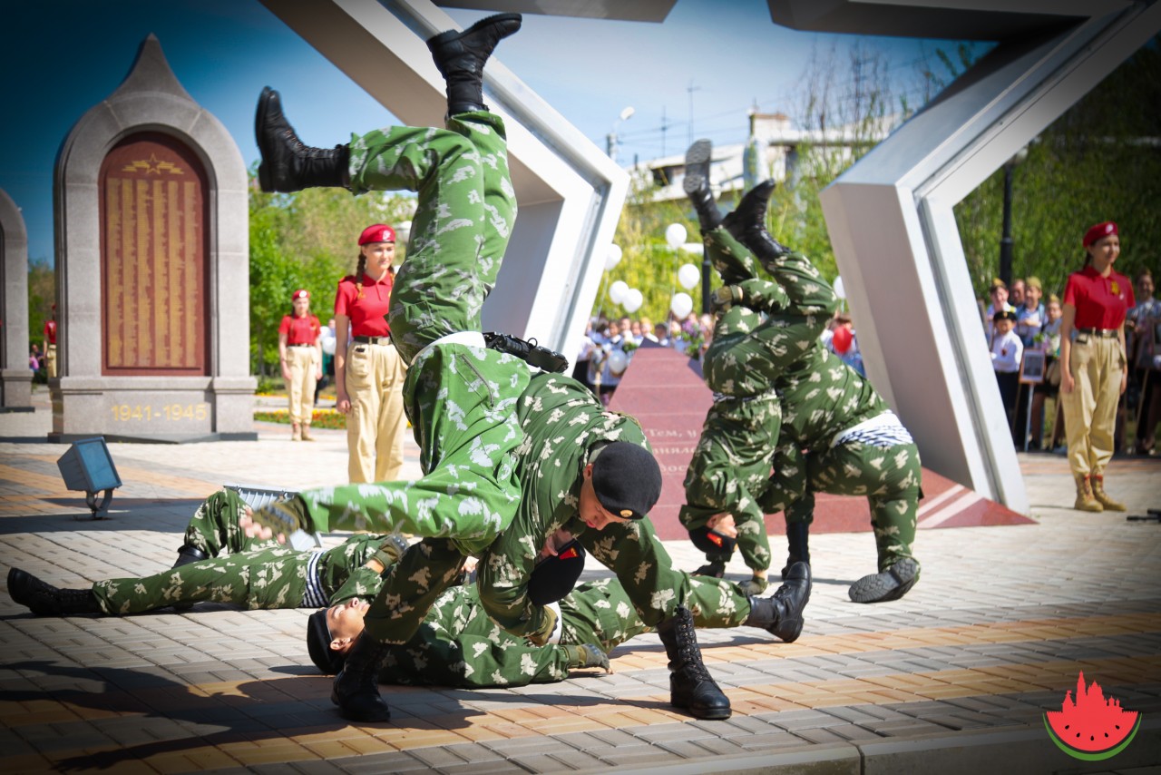 Так, ученики Астраханского специального учебно-воспитательного учреждения закрытого типа показали десятки боевых приемов и кулаками ломали доски. Самые маленькие участники мероприятия, бережно держа в руках таблички с фотографиями своих дедов и прадедов, образовали свой небольшой «Бессмертный полк».