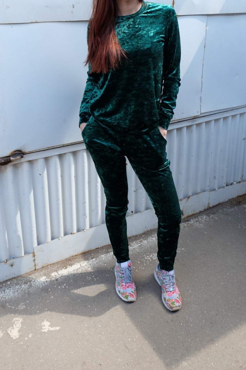 Спортивный костюм под бархат. Забытый на долгое время бархат бил в последнее время все рейтинги. Только настоящий бархат стоит дорого, все что мы видим это в основном велюр. Платья из велюра уже слегка всех достали, что не скажешь о костюмах или свитшотах. Последние (бордового цвета) были в недавней мужской коллекции Adidas Original.